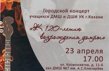 Ровно 120 лет назад, благодаря композитору, организатору и руководителю первого в истории России оркестра народных инструментов Василию Васильевичу Андрееву была «возрождена » домра. Именно поэтому секция струнно-щипковых инструментов решила посвятить Городской концерт этой знаменательной юбилейной дате. Преподаватели и учащиеся подготовили разнообразную программу, состоящую из русской, татарской, зарубежной классики, джазовых композиций, мелодий из любимых кинофильмов и, конечно же, ярких, незабываемых, душевных обработок народных песен. Очень надеемся, что слушатели получат много положительных впечатлений и высоко оценят мастерство юных исполнителей, которые являются лауреатами Международных, Республиканских конкурсов.