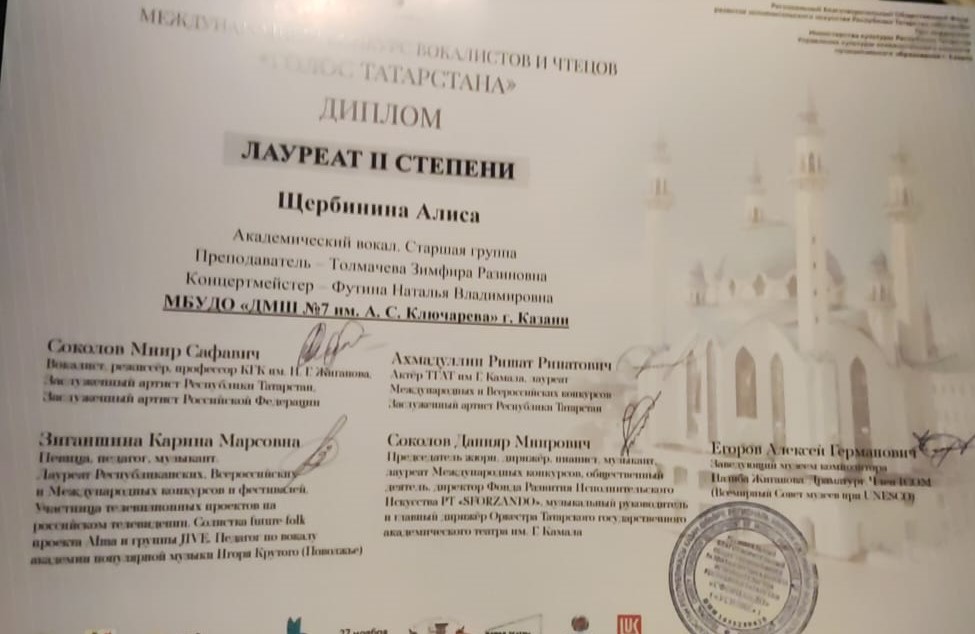 Опубликовано: 27.11.202227 ноября, в день,посвящённый нашим дорогим мамам,ученики класса Толмачевой Зимфиры Разиновны,сделали самый тёплый подарок,став луреатами Международного конкурса чтецов и вокалистов "Голос Татарстана".