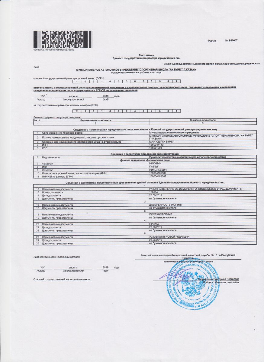 Свидетельство о внесении записи в ЕГРЮЛ