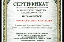 1 апреля в Республиканском конкурсе чтецов «Муса Джалиль в сердцах мира» (к 120-летию поэта) студентка Казанского политехнического колледжа Корнилова Софья получила сертификат за творческую работу на английском языке.