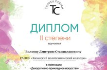 С 17 октября по 31 октября 2022 года на базе ГАПОУ «Набережночелнинский педагогический колледж» проводился Всероссийский фестиваль творчества безграничных возможностей для студентов профессиональных образовательных организаций «Творец судьбы». Из нашего колледжа участвовал студент группы СПу-1219 Волков Д. С. и получил диплом 2 степени в номинации "Декоративно-прикладное искусство". Руководтели: Игнатьева И. А., Матвеева Е. Ю..