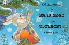 С 29.12.2020г. по 11.01.202г. каникулы. Для обучающихся, имещих академические задолженности с 12.01.2021г. по 26.01.2021г устанавливается дополнительная сессия.