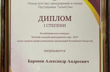 26.04.2023 елда Татарстан Республикасының урта һөнәри оешмалары арасында "Елның иң яхшы яшь укытучысы - 2023" республика конкурсының йомгаклау этабы узды. Безнең укытучыбыз баронов Александр Андреевич актив катнашты һәм лаеклы 1 урынны алды. Без бик горурланабыз һәм аңа яңа җиңүләр телибез! Котлыйбыз!