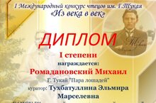 Г. Тукай исемендәге "Гасырдан - гасырга" халыкара укучылар конкурсында Ромадановский Михаил, Св-0222 төркеме, 1 дәрәҗә Диплом белән бүләкләнгән. Җитәкчесе Төхбатуллина Эльмира Марселевна, рус теле һәм әдәбияты укытучысы. Котлыйбыз! Бик яхшы! Шулай тотарга!