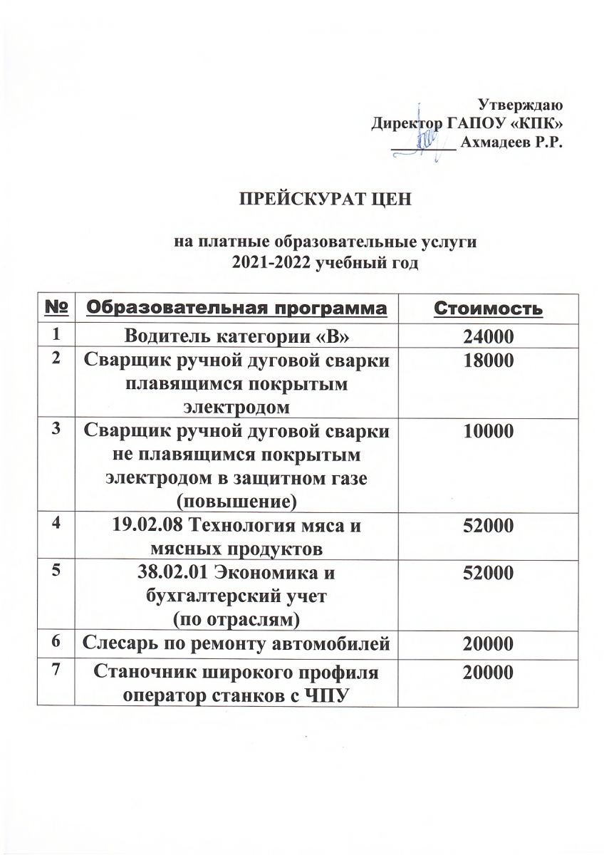 Прейскурант цен на платные образовательные услуги