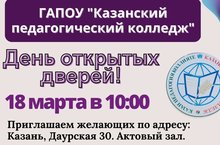 День открытых дверей 18.03.2023 День открытых дверей в ГАПОУ "Казанский педагогический колледж" состоится 18 марта 2023г. (суббота) в 10-00 ч. Приглашаем желающих по адресу: Казань, Даурская 30. Актовый зал.
