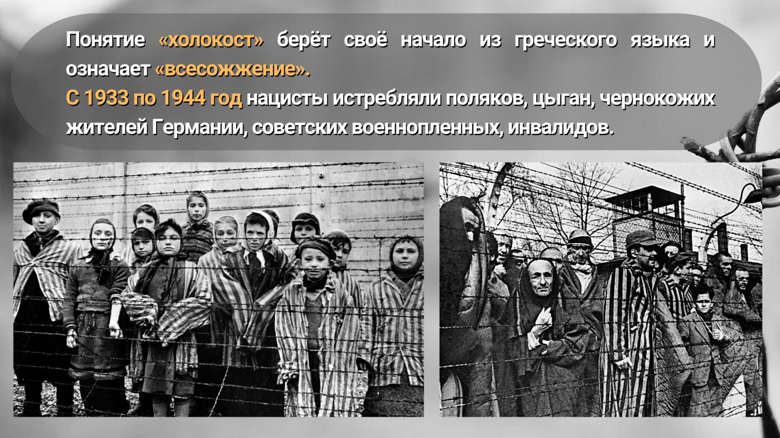 Холокост–это преследование и массовое уничтожение нацистами представителей различных этнических и социальных групп в период существования нацистской Германии.