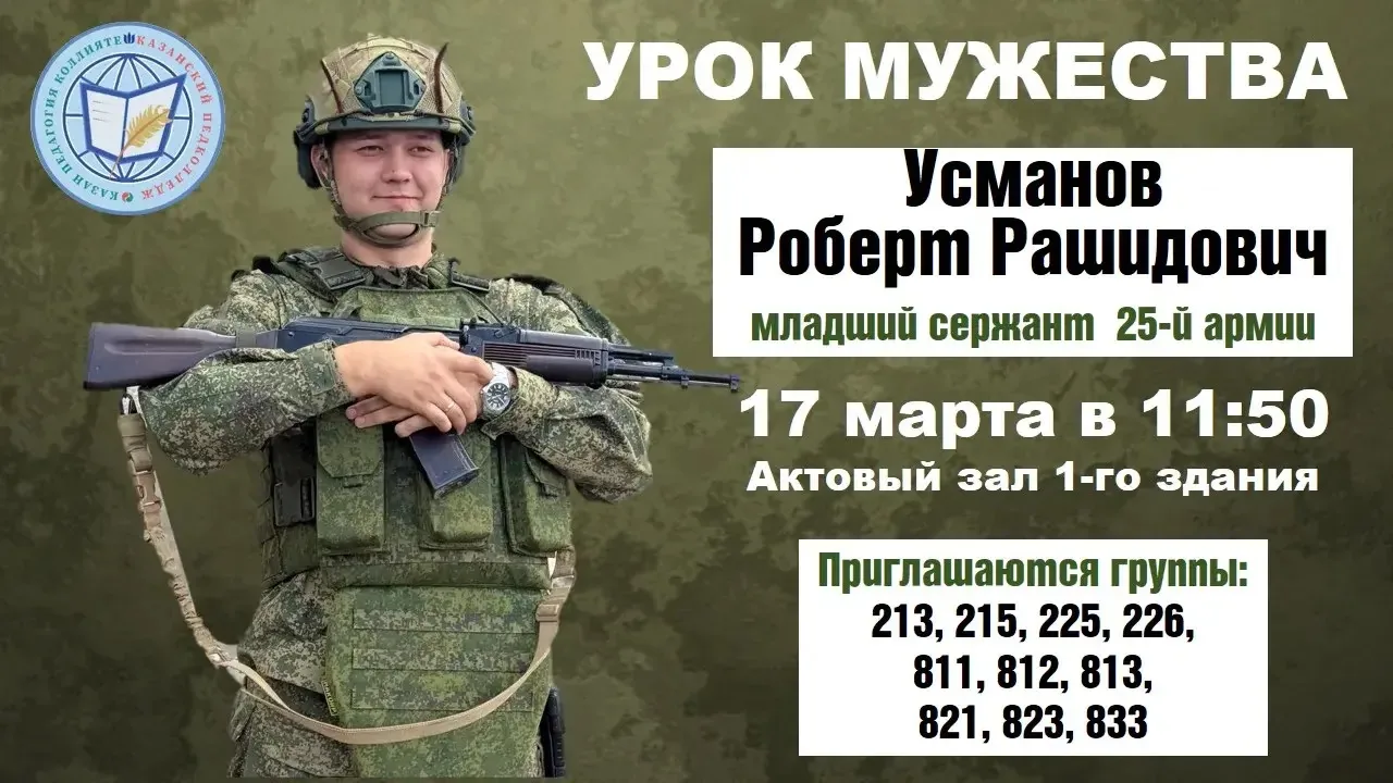 Опубликовано: 17.03.2026Урок Мужества, на котором состоялась встреча с участником специальной военной операции , студентом заочного отделения нашего колледжа Робертом Усмановым, стал важным событием для наших студентов .