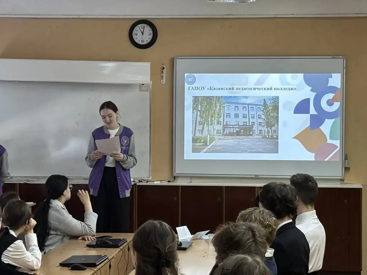 - В рамках данных классных часов старшеклассники познакомились с ключевыми аспектами программы «Профессионалитет», узнали о преимуществах обучения по данной программе, а также о специальностях, реализуемых в Казанском педагогическом колледже.