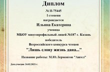 Поздравляем ученика 2А класса Гильмутдинова Карима, ставшего дипломантом 3 степени в VIII Межрегиональном конкурсе чтецов "Туган телем - серле тел". Благодарим Хабибуллину Ф.М. за подготовку призера. Желаем дальнейших успехов!