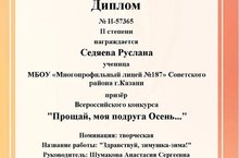 Поздравляем ученицу 7Б класса Седяеву Руслану и ее учителя Шумакову А.С., получивших диплом 2 степени на дистанционном Всероссийском конкурсе "Прощай, моя подруга Осень...".