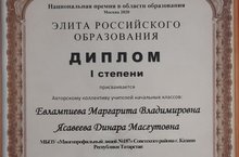 Наши учителя начальной школы Евлампиева М.В. и Ясавеева Д.М. получили диплом 1 степени в Национальной премии в области образования "Элита Российского образования" в номинации "Лучший урок по организации учебной деятельности на основе проблемных ситуаций - 2020".