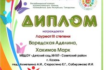 12 сентября 2021 года наши воспитанники Боредская Аделина, Хакимов Марк, Ершова Ева приняли участие в Республиканском конкурсе художественного чтения, посвященном дню Республики Татарстан "Уголок России, с детства дорогой. Нет тебя красивей, Татарстан родной" и стали лауреатами III степени.