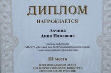 Методическая разработка учителя-дефектолога Детского сада №189 Ахчиной Анны Павловны "Крупяные истории" для детей с расстройством аутистического спектра в номинации "Лучшая практика организации инклюзивного дошкольного образования" получила высокую оценку жюри федерального конкурса «Воспитатели России – 2025». Недавно были подведены итоги регионального этапа XIII Всероссийского конкурса «Воспитатели России». Методическое пособие Анны Павловны стало третьим победителем среди участников из Республики Татарстан.