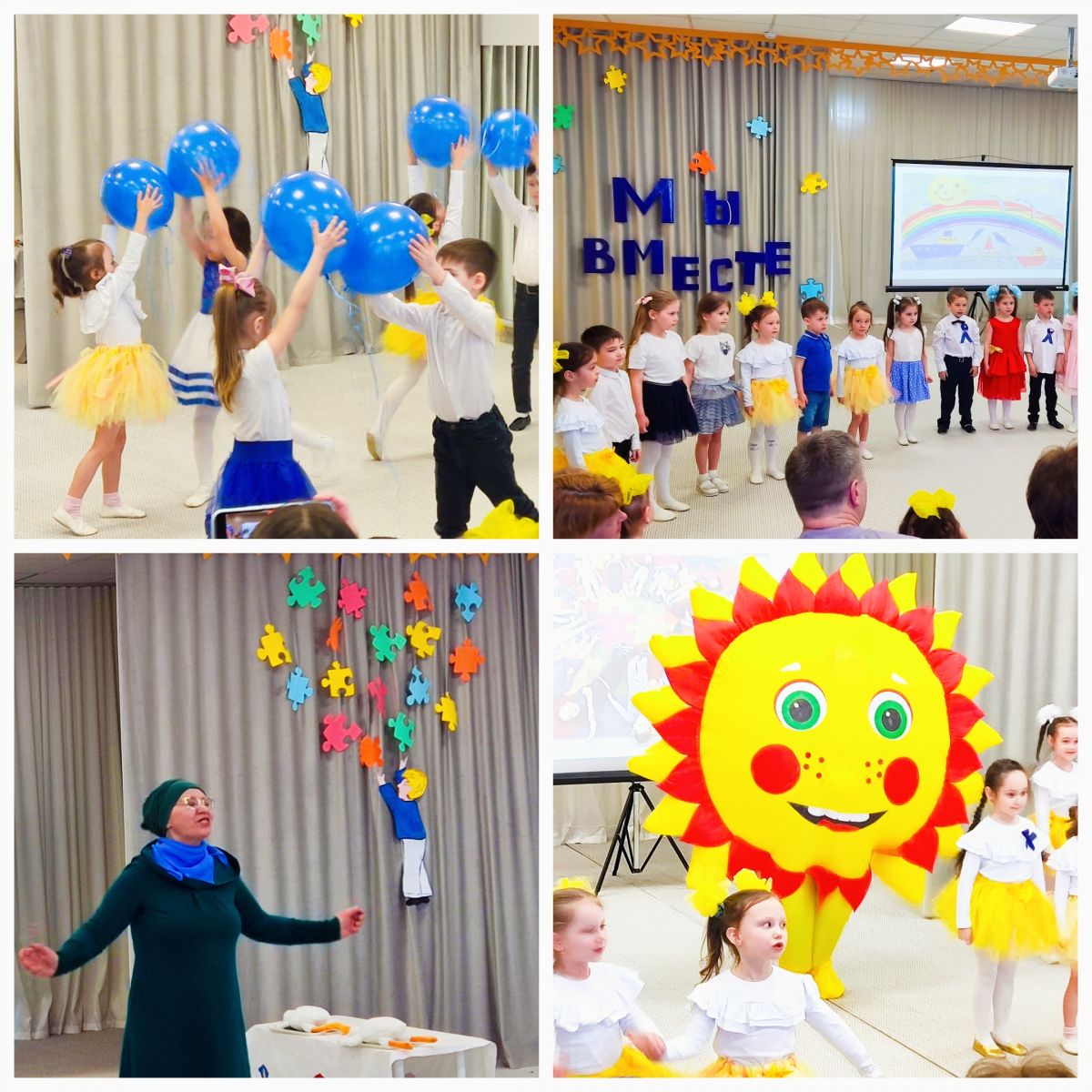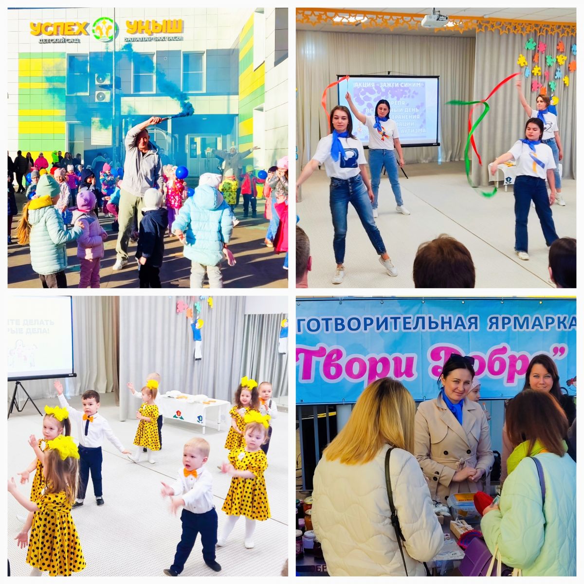 Ежегодно, 2 апреля проводится международная акция «Зажги синим», посвященная Всемирному дню распространения информации об аутизме. В нашем детском саду воспитываются ребята с особыми образовательными потребностями, в том числе дети с расстройством аутистического спектра. В рамках акции мы провели мероприятия - "Монета добра", благотворительная ярмарка "Твори добро", "Благотворительный праздничный концерт", напоминающие о необходимости понимания и принятия людей с расстройствами аутистического спектра. В эти дни для воспитанников проводились коммуникативно-игровые тренинги позитивного взаимодействия, информационные мероприятия по вовлечению детей и родителей в понимание проблемы аутизма, проявления милосердия, заботы и помощи. В холле детского сада и в группах были оформлены информационные стенды. Для родителей подготовлены буклеты, которые помогут узнать больше о проблемах аутизма, понять и поддержать те семьи, в которых воспитываются дети с проблемами в развитии. Окна и помещения групп были оформлены синими шарами и рисунками. Синие тона также присутствовали в одежде детей и взрослых. Все возрастные группы с удовольствием откликнулись на идею принять участие в флешмобе и поддержать детей с расстройством аутистического спектра. Мы разные, но МЫ ВМЕСТЕ!