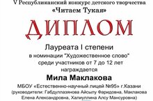 С большой радостью и гордостью поздравляем ученицу 2Г класса Маклакову Милу с успешным участием в пятом республиканском конкурсе детского творчества «Читаем Тукая»! Мила получила высшую награду - диплом лауреата первой степени в номинации «Художественное слово»! Желаем ей дальнейших успехов и побед!! Так держать .Благодарим наставников Милы за то, что разглядели в ней талант, вложили в нее любовь, веру и знания!!