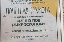 Ученик 5 И класса Долгов Рамиль участвовал в творческом конкурсе "Мой школьный ресторан" и стал победителем.Он снял видеоролик о нашем лицее,рассказал как питаются наши ученики и как стараются повара.Поздравляем.Желаем новых побед!