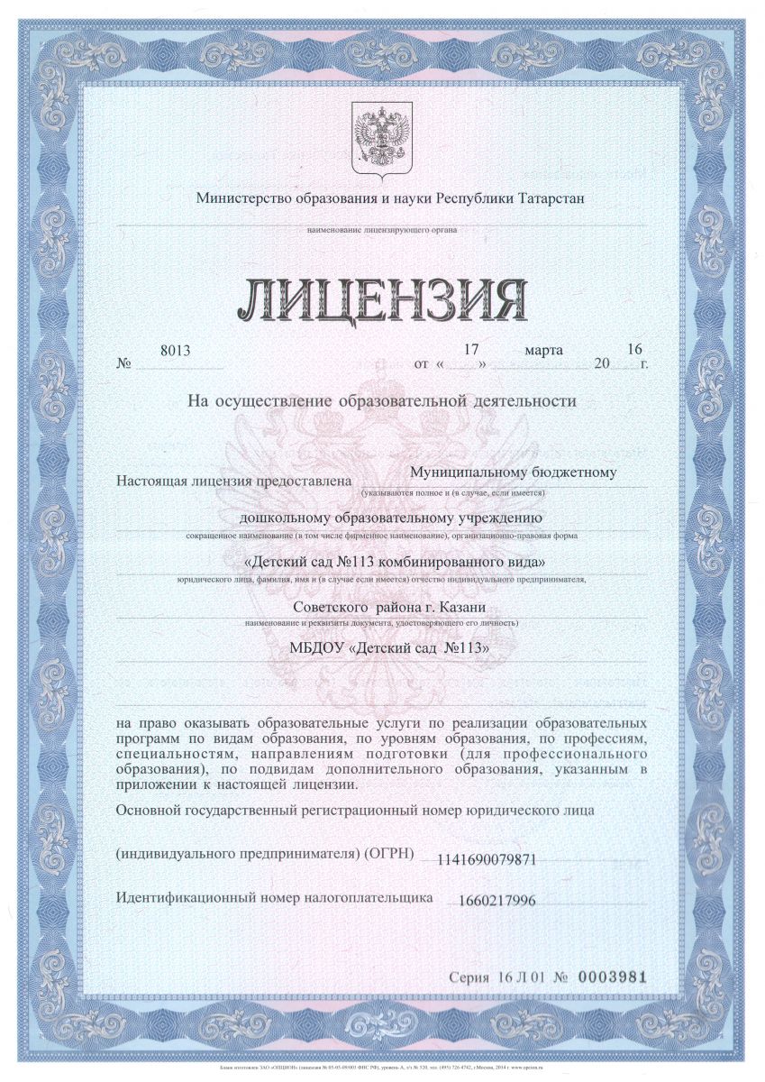 Муниципальное бюджетное дошкольное образовательное учреждение «Детский сад №113 комбинированного вида» Советского района города Казани