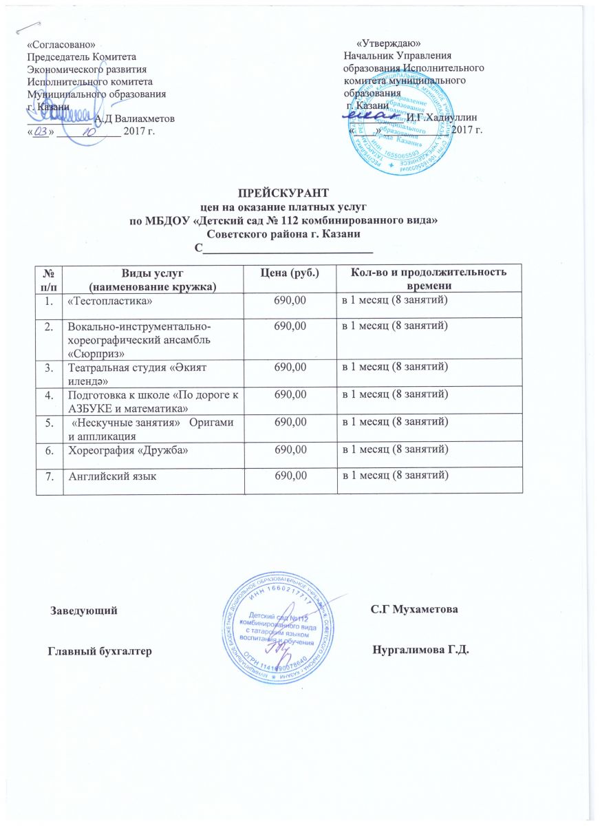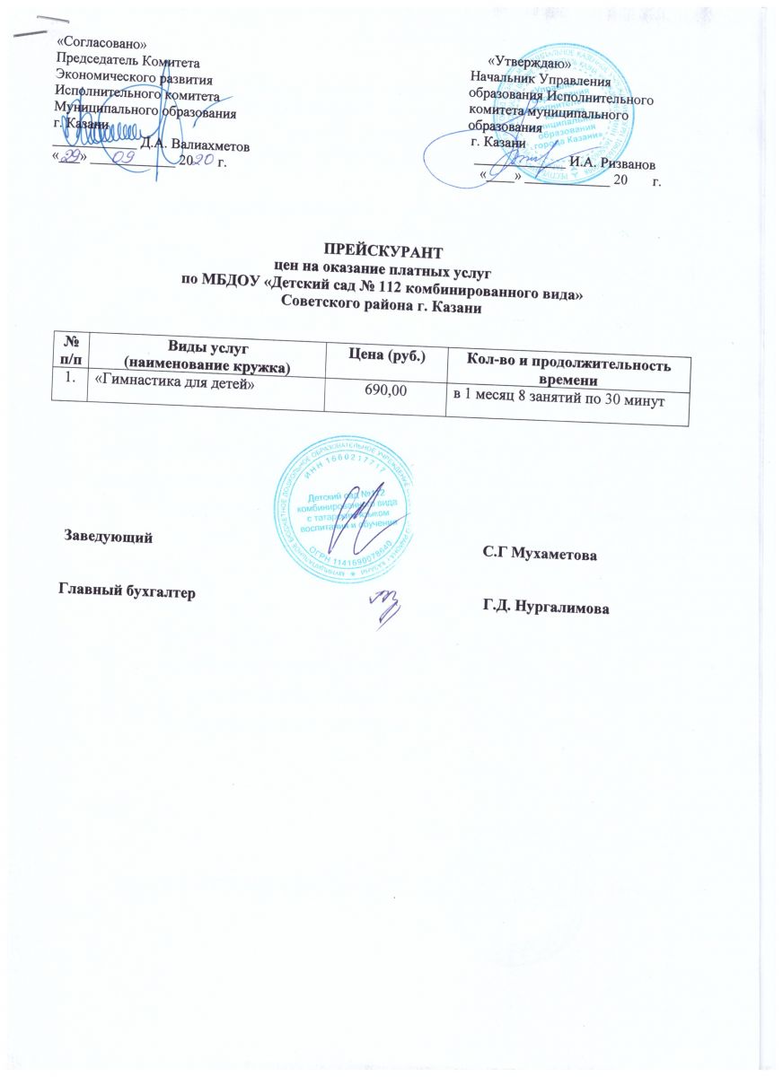 Прейскурант цен на оказание платных услуг. "Гимнастика для детей".
