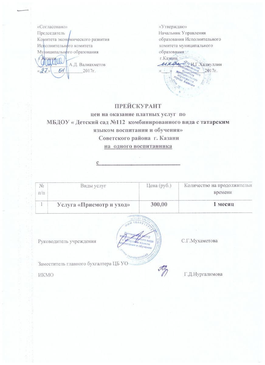 Прейскурант цен на оказание услуг. "Присмотр и уход"