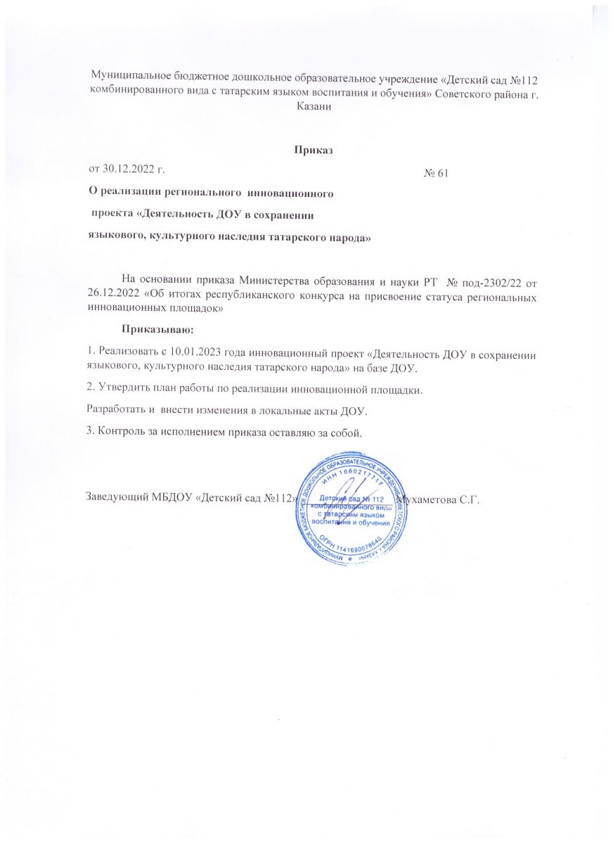 Приказ о реализации регионального инновационного проекта.