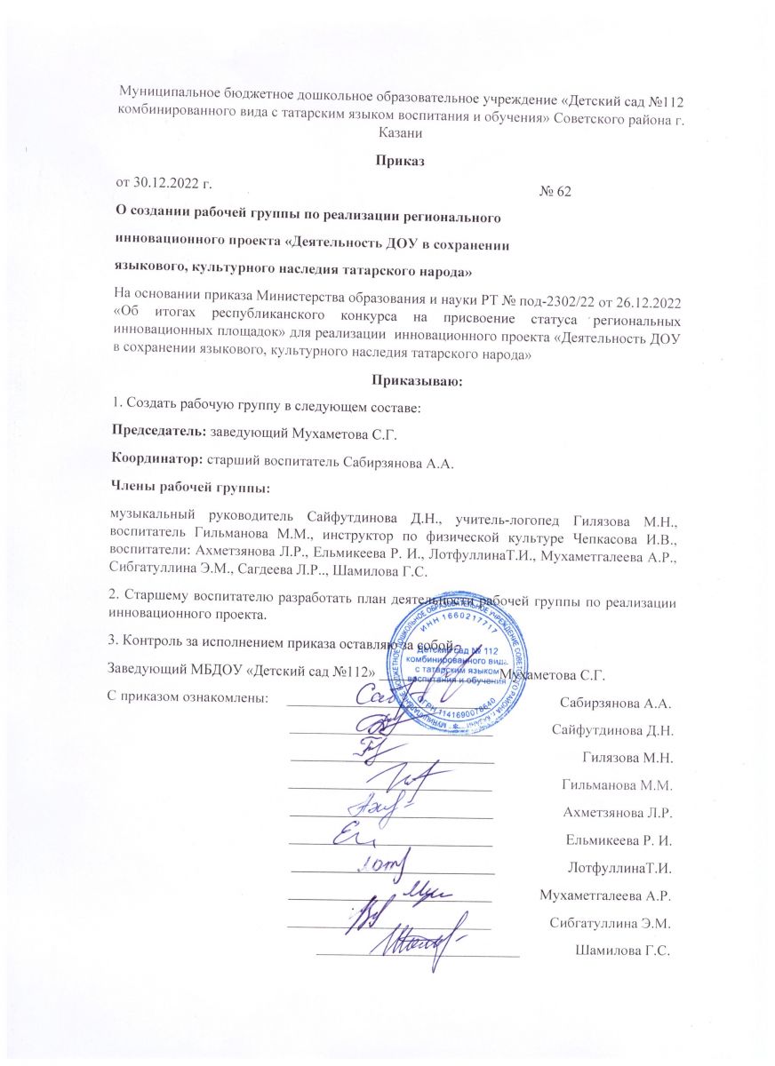 Приказ о создании рабочей группы по реализации регионального инновационного проекта.