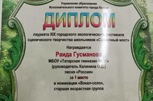 Поздравляем ученицу 6Б класса Гусманову Раиду Руслановну, лауреата 19 городского экологического фестиваля сценического творчества школьников "Солнечный мост" . Руководитель -Калинина О.Д.