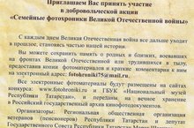 Дорогие учащиеся и их родители! Приглашаем вас принять участие в добровольческой акции "Семейные фотохроники Великой Отечественной войны", отправив копии фотоматериалов с комментариями о родных и близких, воевавших на фронтах или в тылу на адрес fotohroniki75@mail.ru. Все материалы будут размещены на сайтах и останутся на хранении в Росгосархиве конофотодокументов.