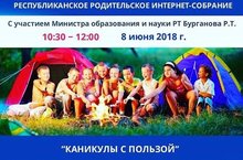 8 июня 2018 года в 10.30 состоится VII заседание Республиканского родительского интернет-собрания. Тема заседания – «Каникулы с пользой (Об организации отдыха и развитии детей в летний период)». Модератором собрания выступит Заместитель Премьер-министра Республики Татарстан – Министр образования Республики Татарстан Рафис Тимерханович Бурганов.
