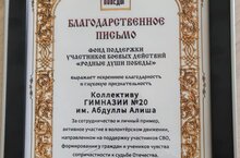 Фонд поддержки участников боевых действий «Родные души победы» выражает искреннюю благодарность и глубокую признательность коллективу Гимназии 20 им.Абдуллы Алиша.