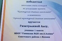 " Укучының мәдәни көндәлеге" проектында гимназиябезнең 1 нче сыйныфы укучысы Гизатуллина Алсу " Иң яхшы мәдәни көндәлек" номинациясендә җиңүче дип табылды. Котлыйбыз һәм яңа уңышлар телибез!