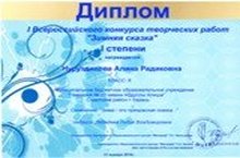 Нуретдинова Алия, ученица 8Б класса стала победителем I Всероссийского конкурса творческих работ « Зимняя сказка» (Учитель - Лебедева Лидия Владимировна награждена Дипломом за подготовку победителя)