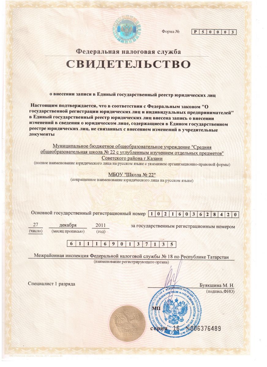 Свидетельство о внесении в Единый государственный реестр