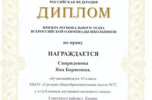 Спиридонова Яна – призёр регионального этапа всероссийской олимпиады школьников по праву! 19.01.2018