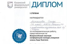 2 ноября в Казанском федеральном университете состоялась Всероссийская научная конференция-конкурс учащихся имени Льва Толстого, в которой достойно защитили свои исследовательские работы ученицы 11А класса нашей школы Ахтямова Саида, награжденная дипломом I степени, и Шилкова Полина, награжденная дипломом II степени. Научным руководителем, подготовившим наших участниц к этой конференции, стала Новикова Ксения Андреевна, учитель немецкого языка. Поздравляем девочек и их руководителя! Желаем дальнейших успехов!