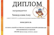 Хамидуллина Алсу (11 класс) - призёр конференции "Дни науки". 06.03.2017