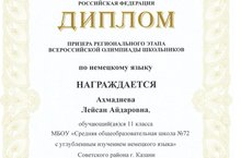 16-18 февраля прошёл региональный этап всероссийской олимпиады школьников по немецкому языку. Ученики нашей школы выступили очень успешно, и четверо стали призёрами. Поздравляем Борисович Марию, ученицу 11 класса, (учитель Чигвинцева Л.М.); Ахмадиеву Ляйсан, ученицу 11 класса, (учитель Чигвинцева Л.М.); Бастракову Анастасию (учитель Халимбаева Э.Г.); Балабину Валерию, ученицу 8 класса (учитель Фельдман Л.М.). Желаем дальнейших успехов!