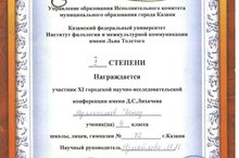 22 февраля прошла XI городская научно-исследовательская конференция имени Д.С.Лихачева. Учащиеся школы успешно выступили со своими исследовательскими работами. Ученик 4Б класса Муллагалиев Дениз (научный руководитель – учитель начальных классов Измайлова М.Н.)завоевал диплом I степени. Ученик 4Б класса Суворов Сергей (научный руководитель – учитель начальных классов Измайлова М.Н.) завоевал диплом II степени. Ученица 9В класса Киселева Анастасия (научный руководитель – учитель немецкого языка Новикова К.А.) завоевала диплом III степени. Поздравляем!!!