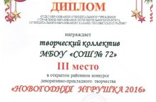 Поздравляем наших талантливых ребят, занявших 3 место в открытом районом конкурсе декоративно-прикладного творчества «Новогодняя игрушка – 2016», целью которого являлось развитие потенциала творчески одарённых детей, повышение культурного уровня подрастающего поколения и формирование эстетических взглядов детей.