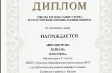 Анисифорова Юлиана - призёр регионального этапа всероссийской олимпиады школьников по немецкому языку. 05.02.2015