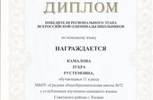 Поздравляем Камалову Зухру, ученицу 11Б класса, ставшую победителем регионального этапа всероссийской олимпиады школьников по немецкому языку. Желаем удачи на заключительном этапе олимпиады!