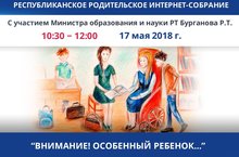 17 мая Министерство образования и науки РТ и общественный совет при Министерстве образования и науки РТ проводит республиканское родительское интернет-собрание "Внимание! Особенный ребенок..." (об особенностях воспитания и обучения детей с ограниченными возможностями здоровья) с участием министра образования и науки РТ Бурганова Р.Т. Online-трансляция на сайте киу.рф. Задайте свой вопрос по адресу roditelirt@mail.ru