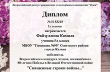 26 мая в ДК железнодорожников состоялся межрайонный этап XII Всероссийского конкурса детского и юношеского творчества «Земля талантов», посвященного 80-летию Великой Победы на тему «Нам этот мир завещано беречь…». В этом конкурсе Файзуллина Камила, ученица 5 А класса нашей гимназии, получила диплом 2 степени.
