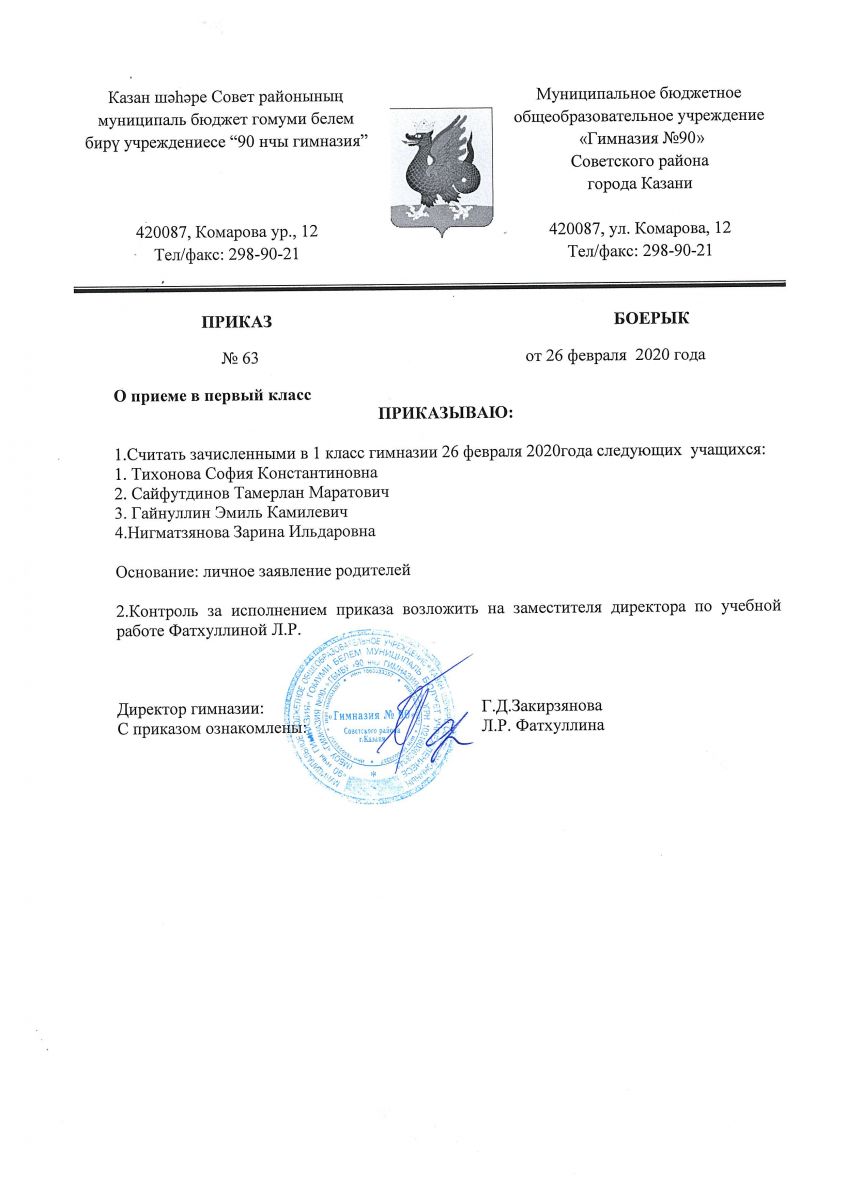 Приказ МБОУ "Гимназия №90" №63 от 26 февраля 2020 года "О приеме в первый класс"