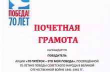 В рамках подготовки к 70-летию Победы учащиеся школы включились в акцию «70 пятёрок-это моя Победа». Подведены промежуточные итоги. Среди учащихся 5-11 классов определились первые победители: Андреева Анна (5к класс), Малышев Булат, Хабибуллин Тимур, Савин Владислав, Евлампиев Николай (6а класс), Валишева Элина, Азизова Виктория (6б класс), Алексеев Артём, Евлампиева Ирина, Куватов Мунир, Перцева Анастасия (7а класс), Киселькова Анастасия, Козулина Светлана, Шумская Алина, Трофимова Ксения (7к класс), Диканова Анастасия (8б класс). Поздравляем победителей! Акция продолжается до 6 мая 2015 года.