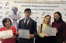 Наши ученики Попов Д., Мурзина Д., Басков И. стали победителями всероссийской научной конференции (с международным участием) им.Н.И.Лобачевского. Руководители: Н.С.Иванова - учитель химии, В.С.Пигарева - учитель английского языка. Поздравляем!