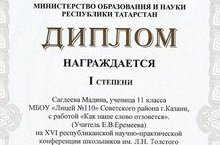 Сагдеева Мадина, ученица 11А класса, награждена дипломом I степени за свою научную работу представленной на XVI Республиканской научно-практической конференции школьников им. Л.Н.Толстого. Научный руководитель - Еремеева Елена Владимировна, учитель русского языка и литературы высшей квалификационной категории. Поздравляем!