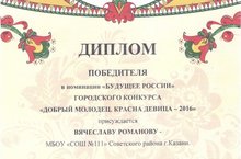 Поздравляем ученика 11 класса Школы №111 Романова Вячеслава с успешным участием с конкурсе «Добрый молодец и красна девица-2016» и победой в номинации «Будущее России». Молодец!!! -