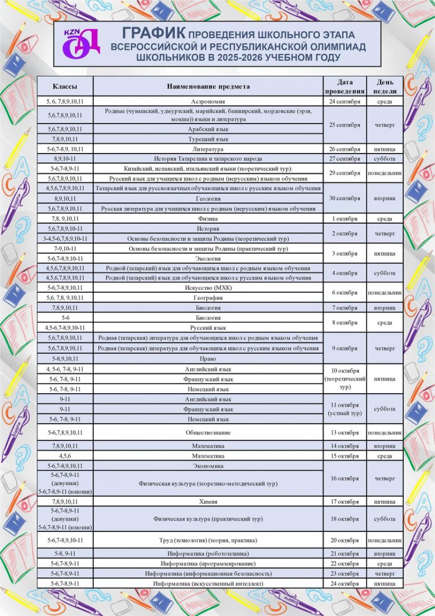 График проведения школьного этапа всероссийской и республиканской олипиад школьников в 2025/2026 учебном году