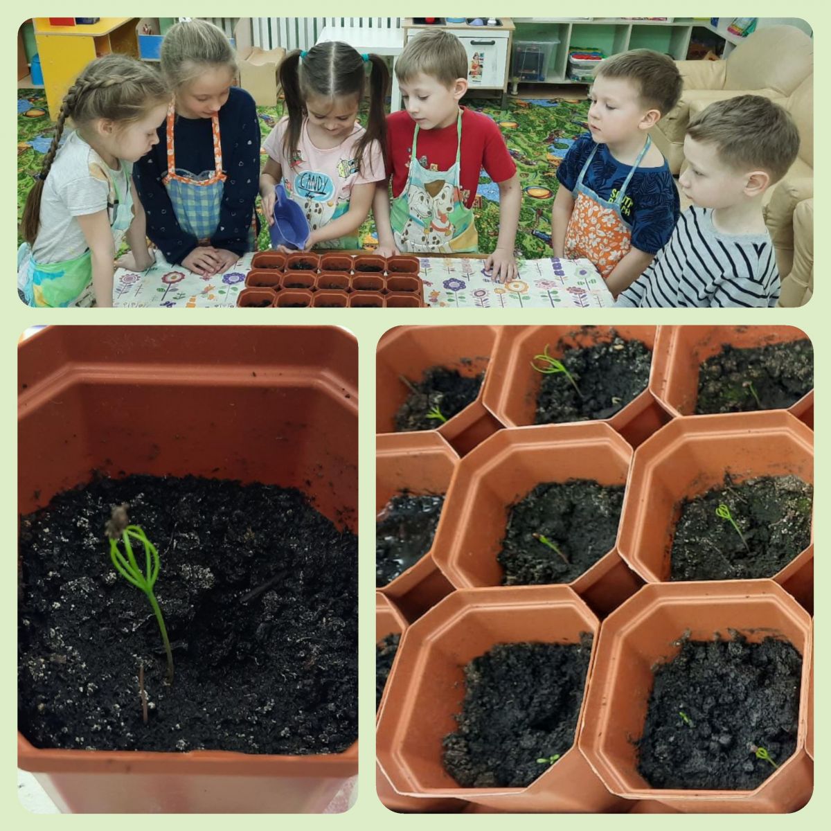 Дети старших и подготовительных групп со своими воспитателями посадили семена сосны и ухаживали за ними.